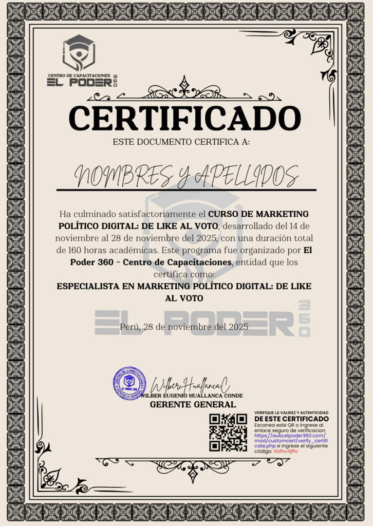 El curso “Marketing Político Digital: Del Like al Voto” tiene como objetivo formar estrategas capaces de diseñar, ejecutar y optimizar campañas políticas digitales efectivas, combinando creatividad, análisis y tecnología.